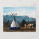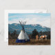 Ein Bild eines Indianers und seines Pferdes in der Nähe eines Tipis. Schnee hat sich auf den höheren Hängen der Berge im Hintergrund niedergelassen.