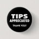 Tipps geschätzte Taste für die Service-Industrie. Manchmal wissen die Kunden nicht, wann es angebracht ist, einen Tipp zu geben, und dieser Button lasse ihnen zu wissen, dass das Tippen zu schätzen ist und sie daran erinnert, Trinkgeld zu geben. Perfekt für jeden persönlichen Service: Kellner und Gastronomie, Autofahrer, Barkeeper, Friseur, Bauunternehmer, Zuhause-Reparatur, Maniküre, Massagetherapeut, Hundezüchter oder Tätowierer. Mit einem einfachen aber auffälligen Knopf das Tippen-Etiquette fördern! Weißer Schriftart auf schwarz oder Ihre Wahl von Farbhintergrund.