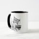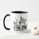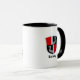 Mug with drawing of two German sailors and the coat of arms of the famous German battleship Tirpitz of world war II with the name of the ship written with fraktur letters.