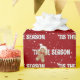 White 'TIS THE SAASON Text mit Lebkuchen Männer und Schneeflocken auf einem roten Hintergrund. Text kann bearbeitet werden. Die Hintergrundfarbe kann geändert werden.