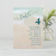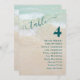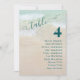 Empfang für Hochzeiten am Strand, Karten für Tischsitze, die die Gäste an jedem Tisch auflisten. Liste der Namen mit der entsprechenden Tischnummer, die auf dekorative Weise am Empfang hängen. Die Gäste können die Karten durchblättern und dann ihren Tisch finden. Der Text "Tisch" wirbeln ist oben auf einem Hintergrund aus Strand und Sand geknackt. Der Text ist dunkel aquamarin mit fett gedruckten Zahlen und Namen rechts ausgerichtet. Die Namensliste enthält 8 bis 12 Namen. Das Design kann angepasst und heruntergeladen werden, um selbst auszudrucken, oder wählen Sie einen Papiertyp und geben Sie eine Bestellung, um eine gedruckte Sammlung von Tischnummer-Karte zu erhalten.