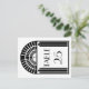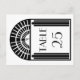 Eine kühn bedruckte Hochzeitspostkarte im Schwarzweiß-Deko-Stil, die beidseitig bedruckt und im Portrait oder in vertikaler Ausrichtung angezeigt wird. Ein Sonnenbrand und oillare Streifen umschließen den dekorativen Schriftart und die Silhouette einer Braut mit ihrem Bräutigam. Art Deco war in den 1920er, 1930er und 1940er Jahren ein beliebter Stil.