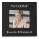 Für Hochzeiten, Veranstaltungen, Restaurant, Café, Bar Tische, Personalisieren und fügen Sie ein Foto, Tischnummern und 2 QR Codes für Ihre Menüs. Schwarzer Hintergrund, weißer Text.