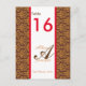 Das ist eine Tischnummer-Karte. Dieses Kartenmuster ist Damask. Diese Kartenfarbe ist braun, rot, weiß und orange.