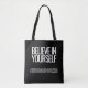 Stilvolle schwarze Tasche mit der auffälligen Botschaft "Glaube an dich selbst" neben einem inspirierend Zitat: "Ein Vogel, der auf einem Baum sitzt, hat nie Angst vor dem Zerbrechen des Zweiges, weil sein Vertrauen nicht in den Zweig, sondern in seine eigenen Flügel liegt." Diese langlebig und vielseitig einsetzbare Tasche eignet sich hervorragend, um das Alltagsmaterial zu tragen und gleichzeitig als ständige Erinnerung der Bejahung, Widerstandsfähigkeit und Positivität zu dienen. Das ideale Geschenk für jeden, der sich auf persönliches Wachstum oder die Notwendigkeit täglicher Ermutigung konzentriert.