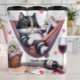 Dieses humorvolle Bild zeigt eine gruselige, schwarz-weiße Katze, die in einer rosa Hängematte sitzt und ein Weinglas mit einer daisy in sich trägt. Eine Flasche Wein, ein weiteres volles Weinglas, ein Korb mit Gänseblüten und schwimmende Herzen umgeben die Katze und schaffen einen lustigen und sarkastischen Kontrast zwischen einer scheinbar entspannenden romantischen Szene und dem verärgerten Ausdruck der Katze.