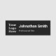 Dieses schwarze Namensschild hat zwei Zeilen weißen Text. Sie können den Text bearbeiten, um den Namen und den Titel des Mitarbeiters anzuzeigen. Ein Anzeigebild befindet sich neben dem Text. Sie können das Bild durch Ihr Firmenlogo ersetzen.