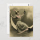 Vintages Foto einer Frau in lang dekoriertem Kleid und Party, das auf einem Halbmond sitzt und in einem Toast Champagnerflasche und -glas zuzieht