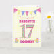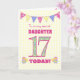 Eine hübsche 17. Geburtstagskarte für Ihre Tochter, mit Polka Punktbündel, Primrosen-Blume und Zahlen gefüllt mit einem Primromuster, alles auf einem blassgelben Karo Gingham Hintergrund. Die Titelnachricht lautet: "Zu einem ganz besonderen DAUGHTER 17 HEUTE!" Die Insider-Nachricht ist nur ein Vorschlag und Sie können sie einfach personalisieren oder löschen, wenn Sie es vorziehen.
