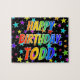 This exciting and fun birthday-themed jigsaw puzzle design has the message "HAPPY BIRTHDAY, TODD" with the characters having a colorful rainbow spectrum inspirred gradient pattern, in Addition to a lively star shapes background pattern. In Colorful Puzzle Like This Might be hat man ein Way to Send Birthday wishes to somebody named Todd. [~ Z0000468]