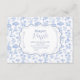 Mit unserer Toile De Jouy Bow Baby Shower Diaper Raffle Enclosure Card fügen Sie Ihrem Baby-Duschbad eine elegante Touch hinzu. Diese bezaubernde Karte zeigt das klassische Toile De Jouy-Muster und präsentiert faszinierende Pastoralszenen, die Ihrem Fest ein Gefühl von Eleganz und Anmut vermitteln. Der zarte Bogen-Akzent fügt sich harmonisch in das Dekor ein und ergänzt die einladende und thematische Gestaltung. Diese Umschließungskarte wurde entwickelt, um sich nahtlos in Ihre Babydusche zu integrieren und lädt die Gäste zur Teilnahme an einer köstlichen Windelverlosung ein. Die Karte enthält eine klare Anleitung, wie die Tombola funktioniert, die die Gäste dazu anhält, im Gegenzug für eine Chance, einen Sonderpreis zu gewinnen, ein Paket Windeln mitzubringen. Die Diaper Raffle Enclosure Card, die auf hochwertigen Cardstock gedruckt wurde, verbessert nicht nur die Dekoration der Babydusche, sondern dient auch als funktionales Element, das Verlobung und Spaß unter den Gästen fördert. Das zeitlose Design macht es für jede Art von Babydusche geeignet, von eleganten Ansammlungen bis hin zu skurrilen Festen. Mit dieser exquisiten Umzäunungskarte können Sie Ihre Liebsten noch unvergesslicher in die Begrüßung der neuen Ankunft eintauchen, während Sie Ihre Veranstaltung mit einer Touch Vintagen Charmes bereichern.