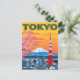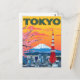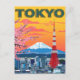 A bold, colorful vintage travel poster illustration featuring the cityscape of Tokyo, Japan. The scene is dominated by the bright red and white Tokyo Tower and a snow-capped Mount Fuji in the background. A flowering cherry blossom tree is prominent in the foreground, set against a vibrant yellow and orange sunset sky. The word "TOKYO" is displayed in large, dark green letters at the top.