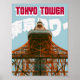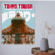 A modern minimalist poster featuring the iconic Tokyo Tower in the foreground against a soft blue background. The bold title ‘TOKYO TOWER’ uses the colors of the Japanese flag, while Japanese typography flows subtly behind the tower, adding depth and cultural character. Clean, balanced, and contemporary, this wall art is perfect for modern interiors, travel lovers, and fans of city-inspired design.
