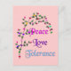 Ein wilder Rose-Busch mit Regenbogenfarben zieht sich über die Worte "Toleranz gegenüber der Liebe des Friedens", um die Botschaft zu vermitteln, dass eine perfektere Welt Kriegsgegner ist, "Nein zu hassen" sagt und für alle Lebewesen, Mensch und Tier echte Gleichheit praktiziert.