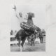 Dieses Vintage-Bild zeigt Tom Mix auf dem Pferd, während sein Pferd aufsteht und sich den Hut windet. Die Szene fand am 21. Mai 1925 bei einer Pferdeausstellung statt.