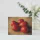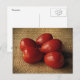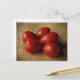 Diese köstliche Postkarte zeigt ein Stillleben Foto von 5 reifen, saftigen, roten Tomaten, die mit großem Geschmack bersten. Sie sind auf einer goldbraunen Strohmatte eingerichtet.