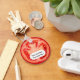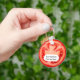 Frische Scheibe Tomate auf einem Schlüsselhalter mit einem Essensthema, das Textfläche hat, den Sie auf einem Budget mit einem Namen, einer Nachricht oder einem Organisationsnamen personalisieren können. Entworfen als Gastgeschenk, geben für eine Organisation oder Mitglieder, oder nur ein niedliches Obsthema Geschenk.