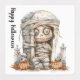 Tombside Trouble - Mummy Mischief & Mini Monsters Label Eine mit Augen Mumie mit einem Skelettgesicht sitzt in einem Steingrab, eine Hand zeigt in spielerischer Distanz. Die Szene wird von zwei geschnitzten Jack-o’-Laternen und kleinen Skelettliedern gesäumt und von Grabsteinen und verstreuten Herbstblättern gerahmt. Das Design verbindet spöttischen Charme mit cartoonischem Unfug, indem es Halloween-Geist durch kühlen Charakter, unheimliche Details und ein Augenzwinkern des Unerwarteten einfängt.