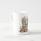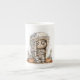 Tombside Trouble - Mama Mischief & Mini Monsters Knochen China Tasse Eine breite mit Augen Mumie mit einem Skelettgesicht sitzt in einem Steingrab, eine Hand zeigt nach außen in spielerischer Distanz. Die Szene wird von zwei geschnitzten Jack-o’-Laternen und kleinen Skelettliedern gesäumt und von Grabsteinen und verstreuten Herbstblättern gerahmt. Das Design verbindet spöttischen Charme mit cartoonischem Unfug, indem es Halloween-Geist durch kühlen Charakter, unheimliche Details und ein Augenzwinkern des Unerwarteten einfängt.