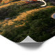 This serene forest pathway poster captures the magic of a sunlit autumn morning—golden rays filtering through ancient trees, illuminating a moss-covered path strewn with vibrant fallen leaves in rich oranges, reds, and yellows. The lush greens, warm earth tones, and soft misty glow create a peaceful, introspective atmosphere of renewal and quiet hope.