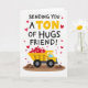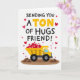This greeting card shows a white background with a cute yellow dump truck in the center, piled high with red and pink hearts. The truck has simple shapes and a friendly look, and it sits on a small patch of brown ground with a few little rocks. Above the truck, the message reads “SENDING YOU A TON OF HUGS FRIEND!” across the top of the card. The words look hand-drawn and slightly uneven, like casual marker lettering, and “TON” stands out in bright yellow. Small hearts float around the scene like confetti, adding to the sweet, caring feel. The whole design leans into friendship and affection, like you’re sending someone a big, warm hug ❤️💌.