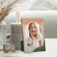 Mit dieser Foto-Plakette mit einem vertikalen oder porträtorientierten Foto in einem einzigartigen Gewölbe, auf einem Hintergrund Bio, waagerechter Streifen in den Farben Waldgrün, Salbei und Pfirsich, entsteht ein unvergesslicher und einzigartiger Abschluss-Sake. Darunter erscheint neben Ihrer Schule oder Uni "Graduate". Personalisieren Sie mit Ihrem Abschluss Jahr gebogen über die Spitze.