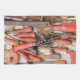 Eine Sammlung alter antiker roter Handwerkzeuge auf einem Tisch auf einem Flohmarkt.