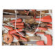 Eine Sammlung alter antiker roter Handwerkzeuge auf einem Tisch auf einem Flohmarkt.