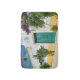 Farbengrüne Holztür mit bunten Blume in Blüte in einem mediterranen Dorf