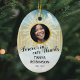 Personalisierte Weihnachtsschmuck für jemanden, der ein Familienmitglied, einen Freund oder ein Haustier verloren hat. Eine perfekte Erinnerungsauszeichnung für die Baumdekoration mit einem wertvollen Foto, den goldenen Toren des Himmels im Himmel, einer weißen Taube, ihrem Namen und Lebensjahren.