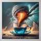 Ein Foto einer Tasse Kaffee mit einem Tornado. Die Kaffeetasse ist weiß mit einem schwarzen Griff und sitzt auf einem Holztisch. Der Tornado kommt aus dem oberen Teil der Kaffeetasse und besteht aus einer wirbelnden Masse an Kaffee.