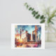 Eine lebendige Darstellung Torontos zeigt seine berühmte Stadt mit dem Rathaus, dem CN Tower und der modernen Architektur an einem farbenfrohen Himmel. Reflektionen auf dem nassen Boden und eine Straßenbahn fügen der urbanen Szene dynamische Elemente hinzu.