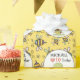 Niedliche Cartoon Schildkröte mit einem rosa Liebe Herzballon. Er hat einen grünen Kopf und Beine, einen gelben Körper, eine braune Muschel und ein hübsches Gesicht. Neben ihm ist eine kleine, gelbe Blume. Die Kante ist gelb mit einem Bienenmuster. Vorlagen, um den Geburtstagsnamen und das Alter hinzuzufügen.
