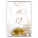 Herbstsonnenblumen färben diese Boho Tischnummer Karte. Delikate Kalligraphie und Tinte zeichnend, mit dem Tracery der florentinischen Blumenelemente. Künstlerisch, elegant und einzigartig.