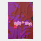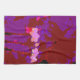Das abstrakte Tapiszierdesign von ZoeSPEAK auf diesem Küchentuch begann als Zoes originales Nahaufnahmen von Bougainvillea-Blume. Das Rosa der Armbänder ist Terrakotta und lila geworden. Die weißen Blume sind rosa geworden. Der Hintergrund ist schwarz, blau violett, gelb und tiefrosa Punkte verstreut über die Formen.