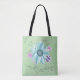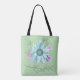 Hellgrüner Totbeutel mit aquamarinen Blume und Reben mit violetten Blumen auf Grün