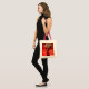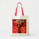 Ein Foto eines Holzsoldaten, der bei Weihnachtsgeschenken stehend ist und leuchtend rot ist. Mit einem Weihnachtsbaum und Licht ist im Hintergrund. Das ist auf einer Tote-Tasche.