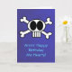 Eine themenorientierte Geburtstagskarte des Piraten. Coole, niedliche und lustige grafische Illustration des Schädels und der gekreuzten Knochen. Ein weißer Schädel mit großen blauen Augen und den langen weißen Zähnen. Lila Hintergrund. Fertigen Sie die Mitteilung besonders an oder verlassen Sie, wie ist.