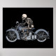 Skelettfahrer auf einem Vintagen, maßgeschneiderten Fahrrad vorbei an einem niedrigen Schild. Farbige Tinte zeichnend auf T - Shirt, Hoodies, Plakaten, Geschenken.
