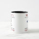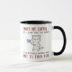 Das Design der Tasse mit der Touch My Coffee Meme und einer gruseligen Katze mit einer blauen Polka gepunkteten Kaffee-Tasse.