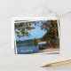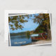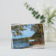 Postkarte der traditionellen bunten Touristenboote im Bled-See unter einem Kastanienbaum in einer Herbstlandschaft in Slowenien mit weißer Grenze und dem Text: "Slowenien", ein wenig gedreht, wie es sich verlegt.