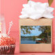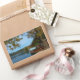 Rechteckiger Aufkleber mit bunten Fotos im Bled-See unter einem Kastanienbaum in Herbstfarben in einer Herbstlandschaft in Slowenien.