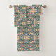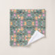 Towel set and washcloth with a colorful, playful pattern featuring cupcakes, stars, and geometric shapes on a muted green background.