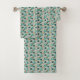 Towels with a teal floral pattern hang on a rod, and a matching washcloth is folded below. The design is vibrant and cheerful.