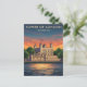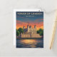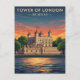 A picturesque illustration of the historic Tower of London with a vibrant sunset sky and its reflection shimmering on the water.