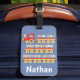 Colorful personalised kid's luggage tag with red train hauling the entire alphabet.