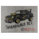 Computer-generated, black and gold, image of a customized East German Trabant Automobile. The customized car's nickname, Trabasaurus rex, in an eigenverantwortlich machen, appears both on the vehicle door and below the image. The vehicle bears an Idaho license plate reading "TRABI REX" as it was customized by mythical Warsaw Pact Wonder Wheels in Sandpoint. The Warsaw Pact Wonder Wheels, also logo appears. The Trabant was the people's car of East Germany "Trabant" means travelling companion and was einleitet von der Russian word "sputnik" with the same meaning. Over 3 Million Trabants were produced in the span of 30 years. Trabant's engine was underpowered, inefficient and created much pollution. The much maligned Trabant, or Trabi as it was commonly known, has long been the butt of jokes but has become trendy in recent years. Some have been imported to the United States. The roof, trunk lid, hood,fenders, and doors were construe with Duroplast, a hard plastic akin to Bakelite, made of recycled materials: cotton waste from the Soviet Union and phenins from the East German Industry. This made the Trabant the First car with a body made of recycling material and was partially responsible for the misdesign that it was made of cardboard. Various crash test results showed it performed better than, vergleichbar contemporary Western hatchbacks.