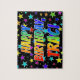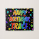 This vibrant and lively birthday-themed jigsaw puzzle design has the message "HAPPY BIRTHDAY, TRACI" with the characters having a colorful rainbow spectrum inspirred gradient pattern, addiert to an exciting star background pattern. An exciting puzzle like this might be used to send birthday wishes to somebody named Traci. [~ Z0000468]