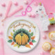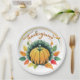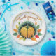 Celebrate Thanksgiving in style with this festive paper plate, designed to bring warmth and charm to your holiday table. The plate features a vibrant autumnal color palette, showcasing rich hues of orange, gold, and brown. At the center, a cheerful illustration of a classic Thanksgiving turkey is surrounded by fall leaves, pumpkins, and acorns, evoking the spirit of the season. Scalloped edges add a touch of elegance, while the sturdy construction ensures the plate can hold generous servings of your favorite Thanksgiving dishes. Perfect for family gatherings, potlucks, or school events, this Thanksgiving paper plate combines practicality and seasonal cheer, making every meal feel special.