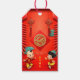 Feierliche traditionelle chinesische Gruß mit Feuerrackern, Glücksknöpfen und schönen Wolken + goldenes Pferdepapier geschnitten + zwei niedliche Kinder zu wünschen Happy New Year. Design auf dem Geschenk-Tag mit der Nachricht, um im Rücken zu personalisieren. Perfekt für das chinesische Neujahr des Pferdes 2026.